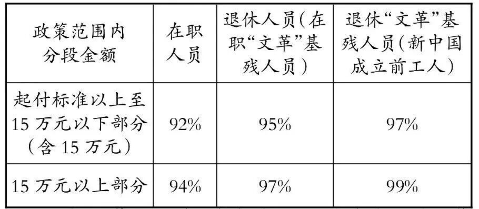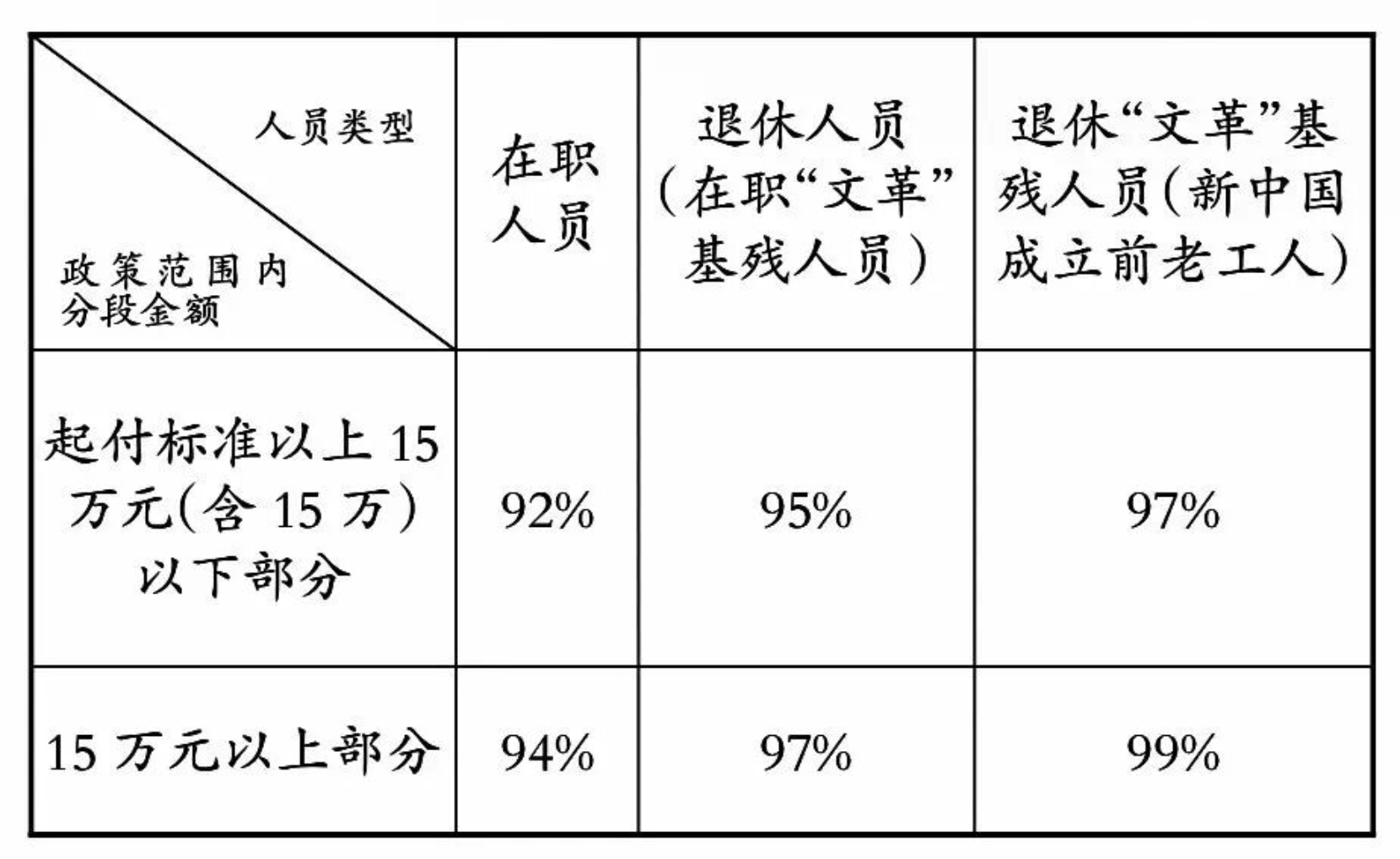 起付标准以上、最高支付限额以下政策范围内医疗费用,三级定点医疗机构在职职工支付比例50%、退休人员支付比例55%;二级及以下定点医疗机构在职职工支付比例60%、退休人员支付比例65%。