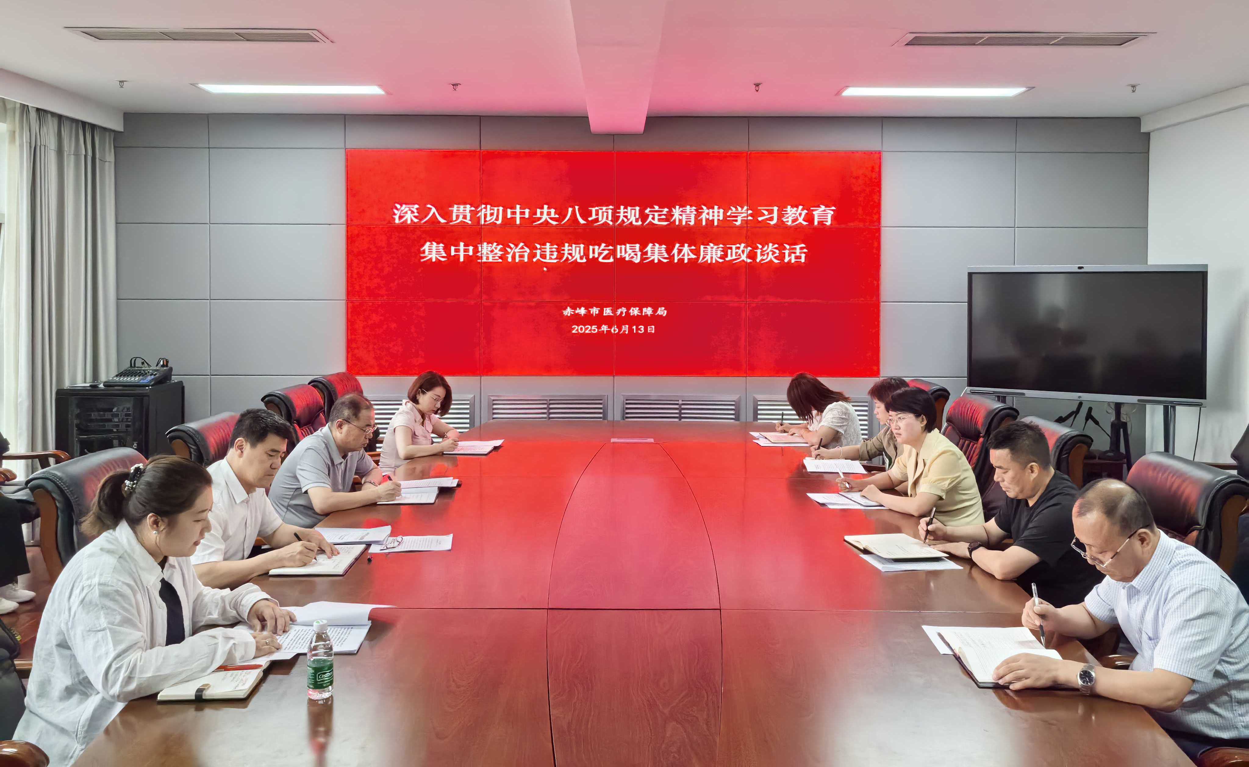 为进一步推进深入贯彻中央八项规定精神学习教育走深走实,6月13日,市医疗保障局党总支所属机关党支部和市医疗保险服务中心党支部组织开展深入贯彻中央八项规定精神学习教育集中整治违规吃喝集体廉政谈话。局机关和市医疗保险服务中心全体干部职工参加会议,局机关党支部书记杨智明和市医疗保险服务中心党支部书记范体志进行了廉政提醒谈话。市纪委派驻卫健委纪检组副组长李欢通报了医保领域违规案例,提出纪律要求。局党组书记、局长王丽丛列席会议并讲话。