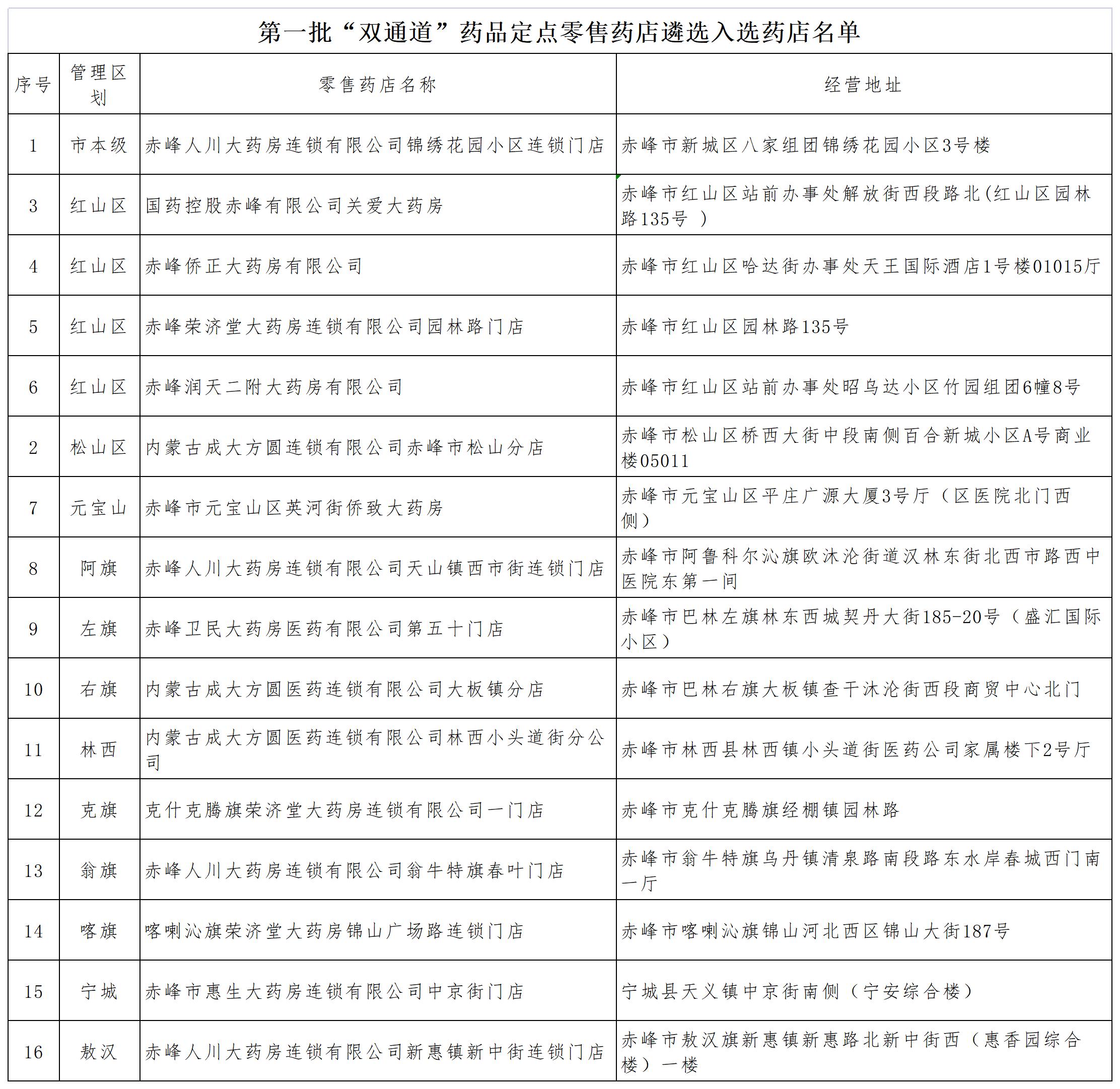 关于赤峰市第一批“双通道”药品定点零售药店遴选结果的公示