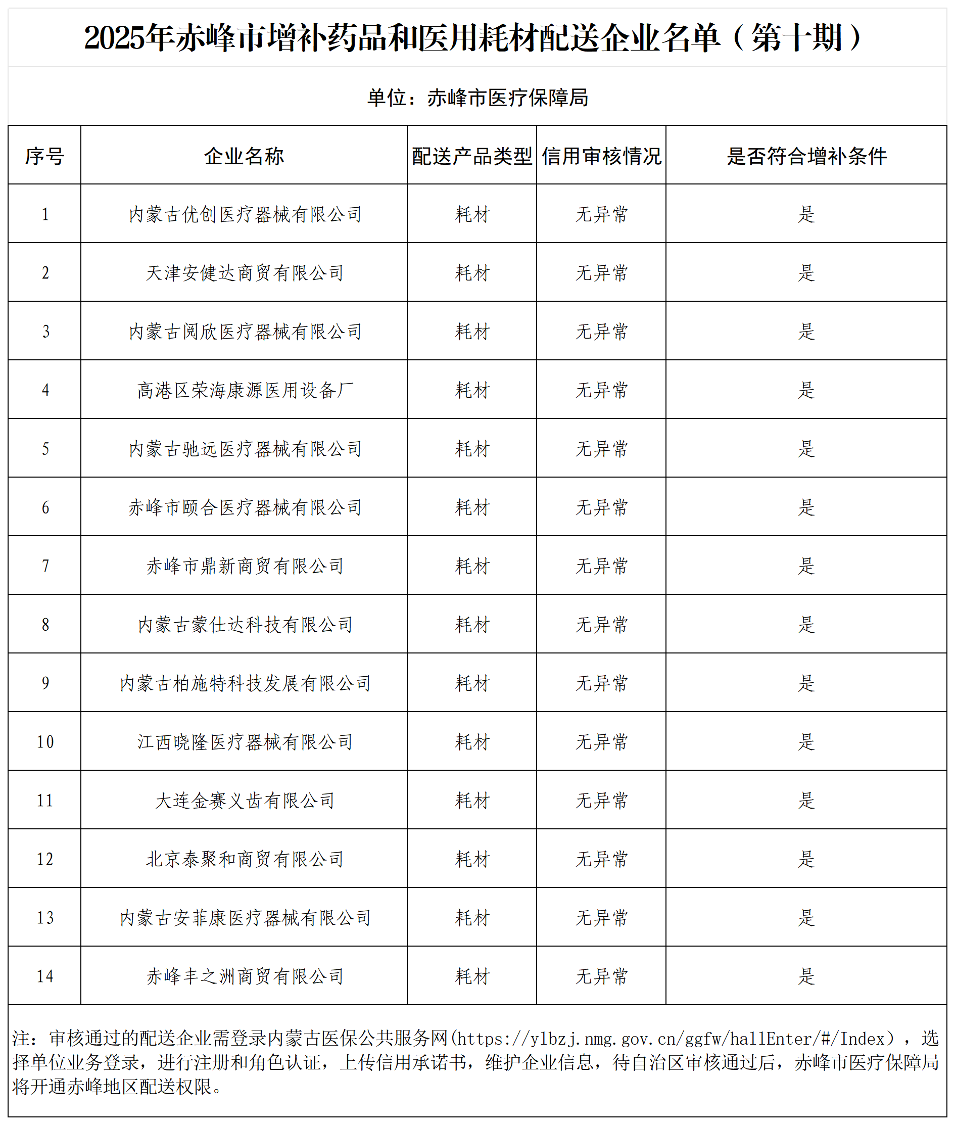 2025年赤峰市增补药品和医用耗材配送企业名单(第十期)