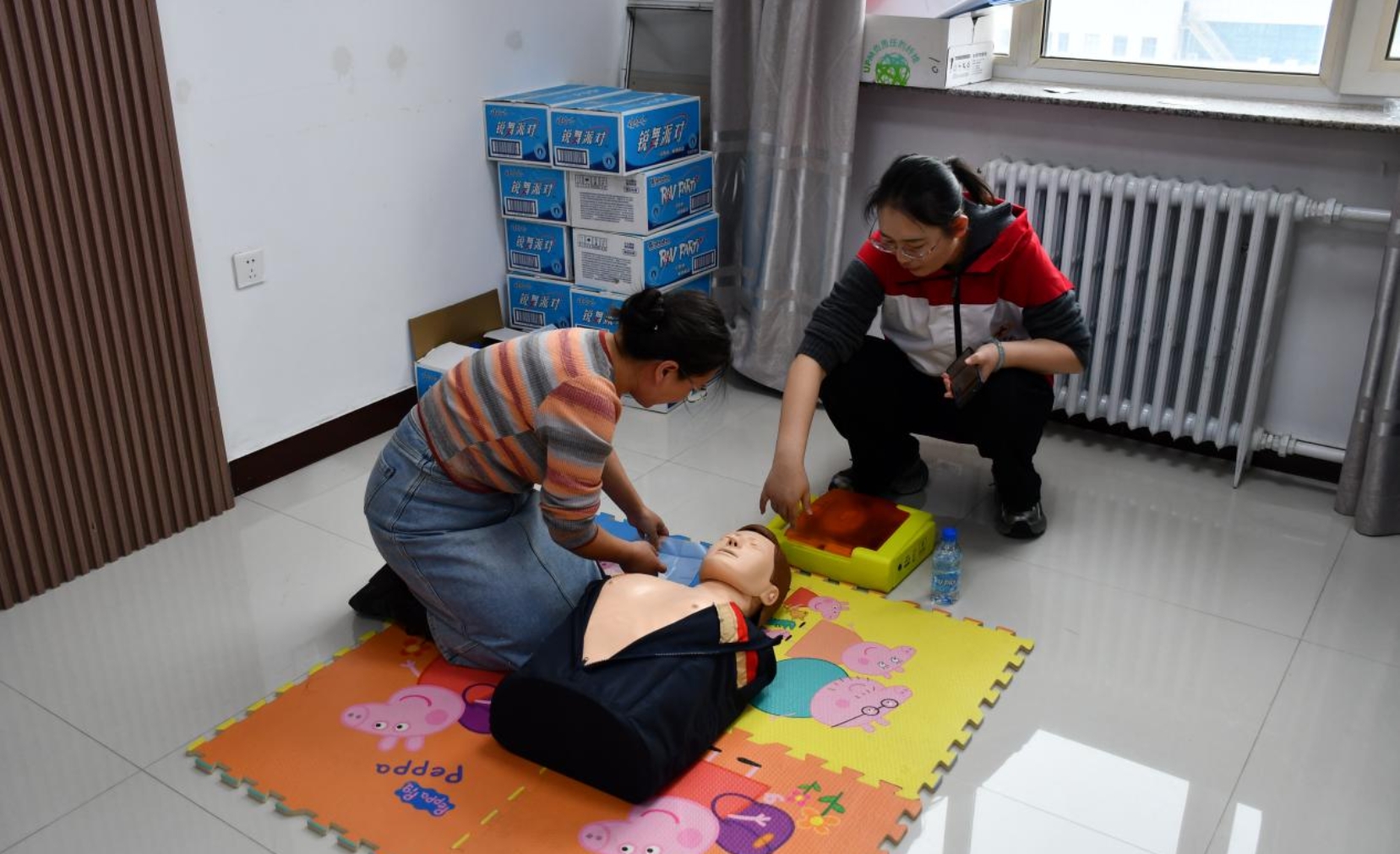 本次培训采用“理论讲解 + 实操演练 + 考核认证”三位一体的教学模式,课程内容紧贴日常工作生活中的急救需求。旗红十字会讲师们围绕心肺复苏、气道异物梗阻急救、外伤规范包扎、烧烫伤应急处置等核心知识点进行系统授课,同时现场演示了AED(自动体外除颤仪)的操作流程与使用要点,让参训人员清晰掌握急救关键步骤。在实操环节,学员们分组进行模拟演练,讲师全程跟班指导,针对按压深度、包扎角度等细节问题及时纠正,确保每位学员都能精准掌握急救技能,培训现场学习氛围浓厚、互动有序。