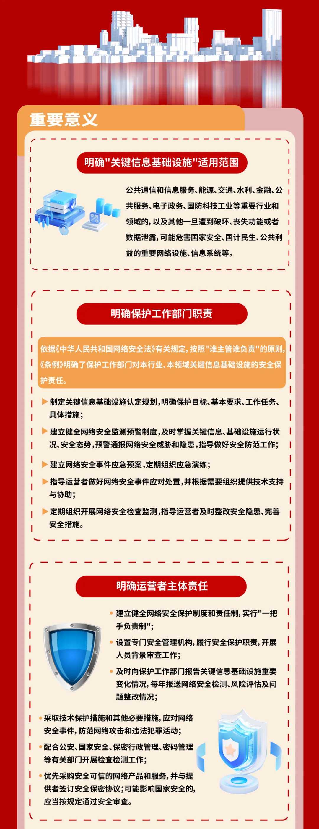 关键信息基础设施是网络安全的重中之重,是关乎国家安全的“命门”所在,是国家安全的重要战略资源。《关键信息基础设施安全保护条例》(以下简称《条例》),自2021年9月1日起施行,标志着我国建立起关键信息基础设施安全综合保护责任体系,进一步提升了我国关键信息基础设施安全保护能力。让我们和小安一同重温《条例》的主要内容,共同筑牢网络安全屏障,为网络强国、数字中国建设提供坚实安全保障。